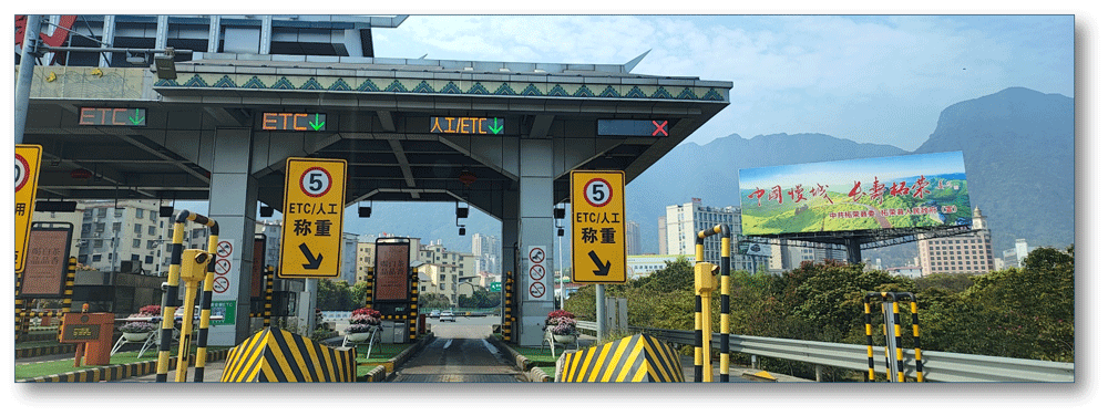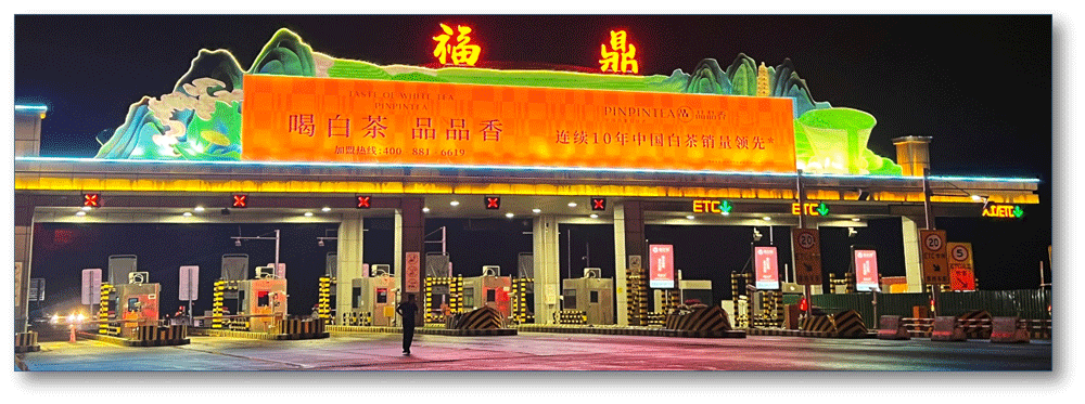 地处福鼎收费站顶棚,无任何视觉遮挡,独立醒目,主线及收费站出入多方向视觉效果,可视有效距离有效500米。