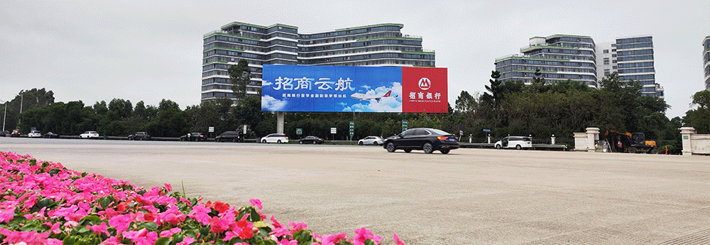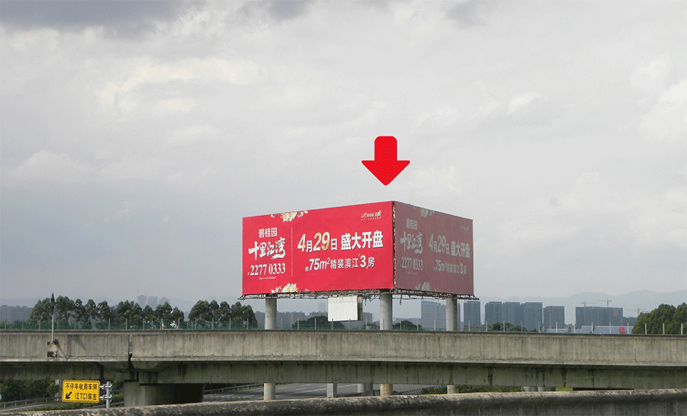 地处福州福州南收费站前南屿枢纽绿化带,无任何视觉遮挡,独立醒目,主线及收费站出入多方向视觉效果,可视有效距离超过1000米。