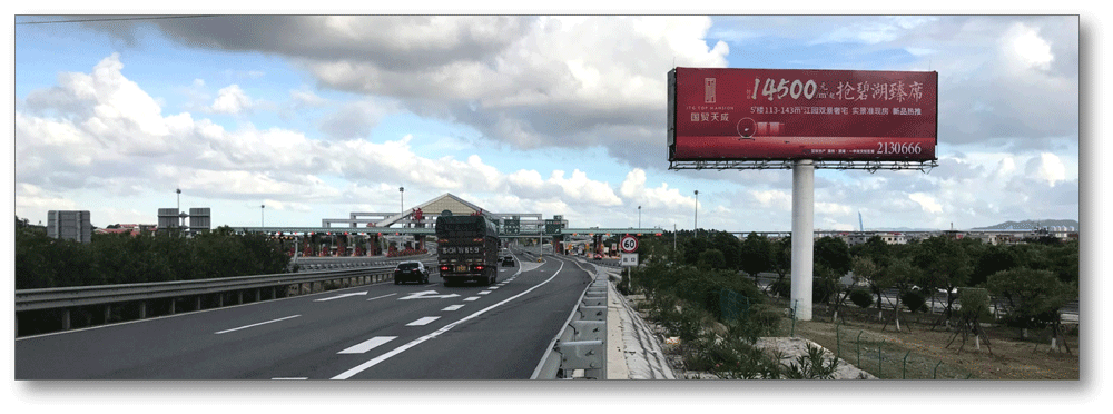 地处漳州港互通绿化带,无任何视觉遮挡,独立醒目,主线及收费站出入多方向视觉效果,可视有效距离超过1000米;